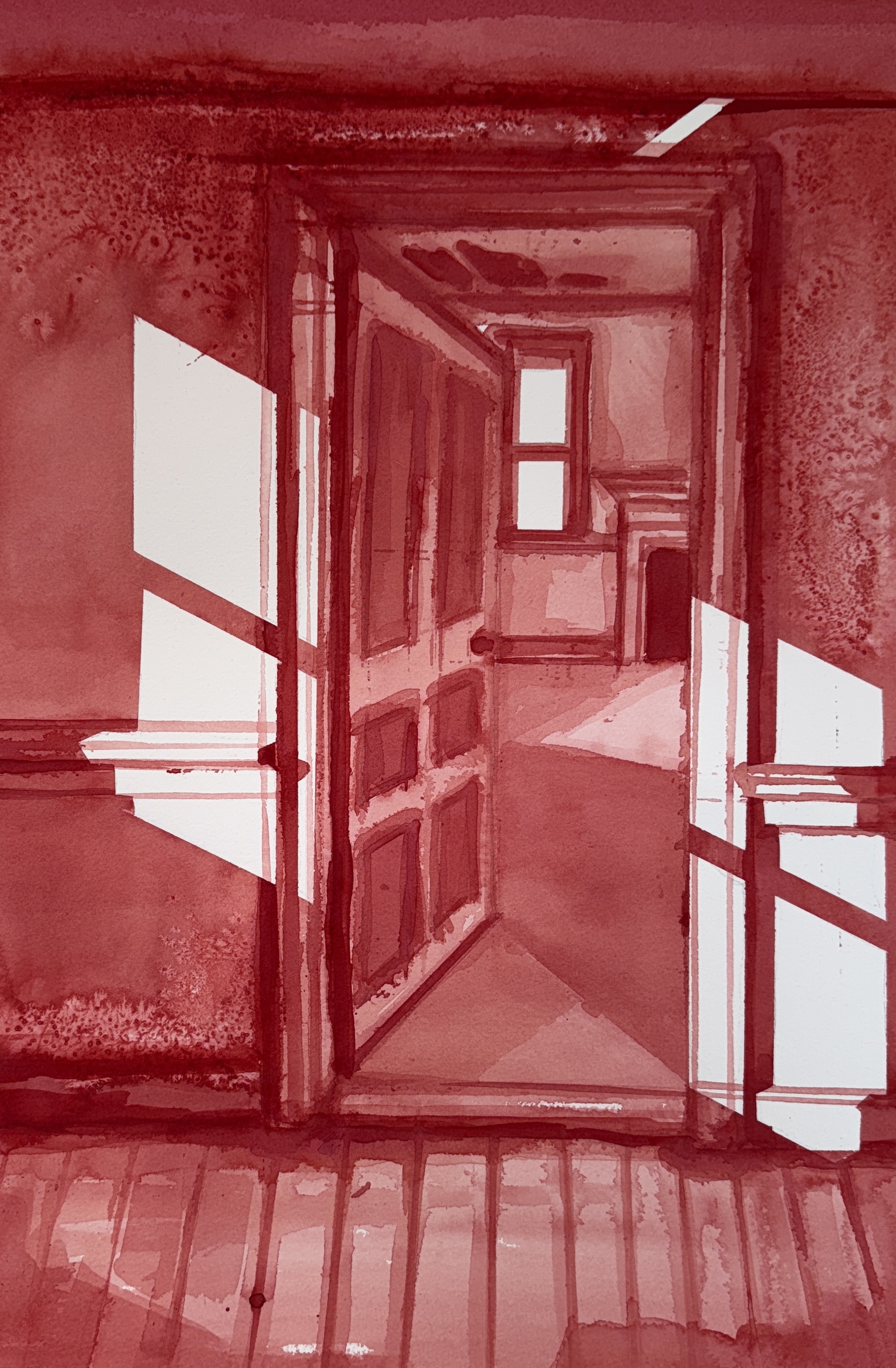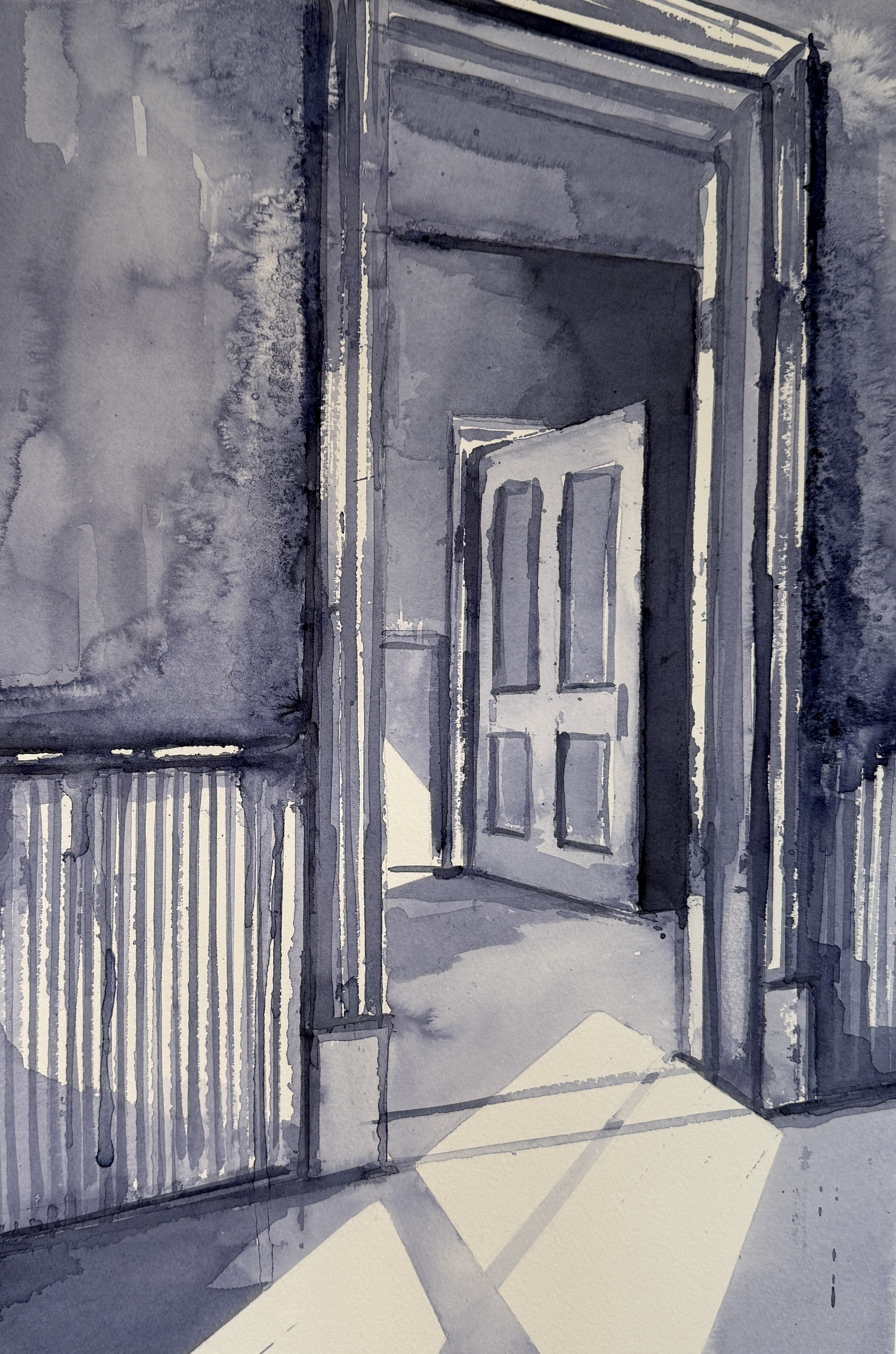 IN THE DOOR OPENING, flydende tusch på papir, 70x50 cm indrammet -