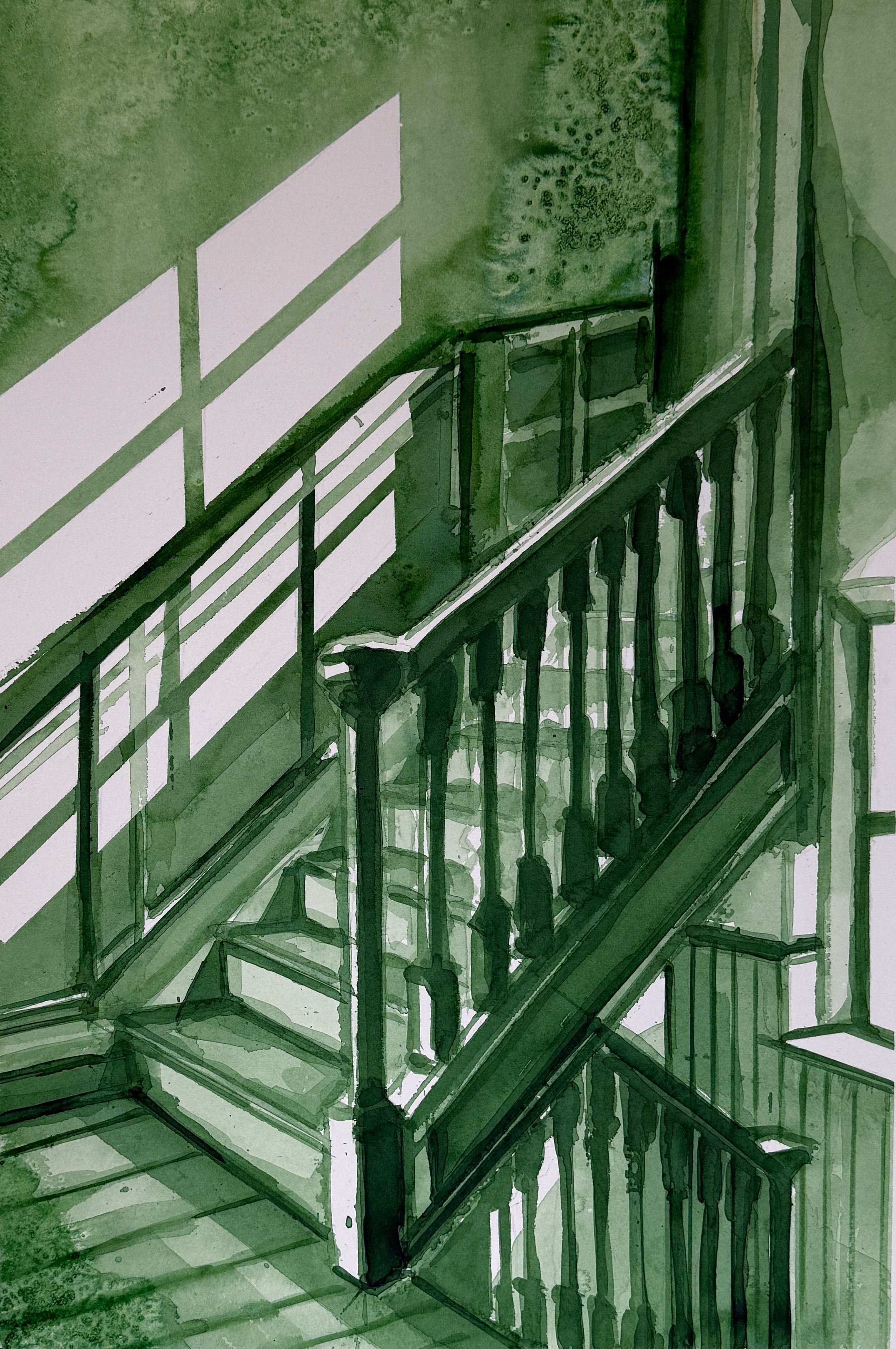 THE GREEN STAIRCASE, Indian Ink on paper, 70x50 cm indrammet, 2025 -